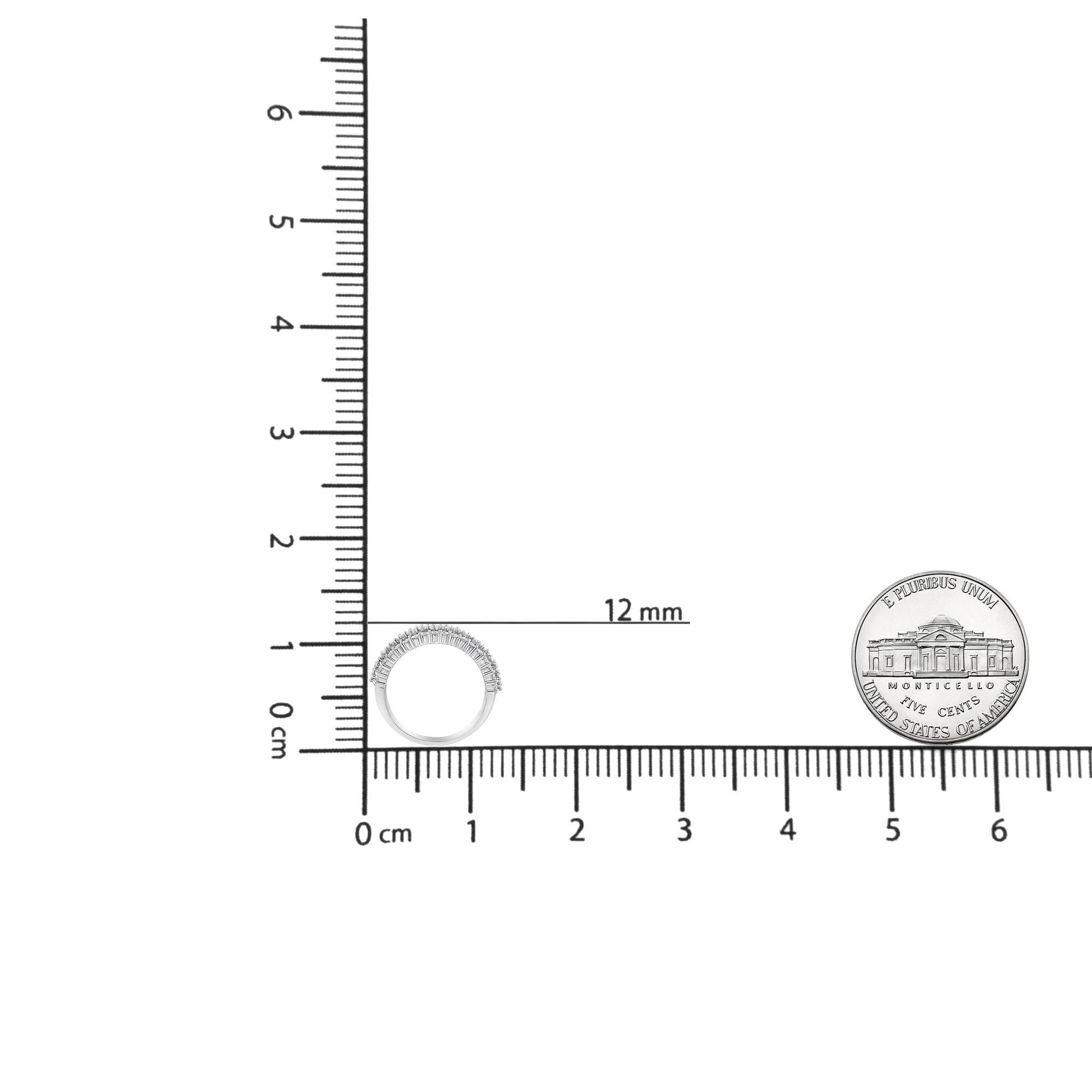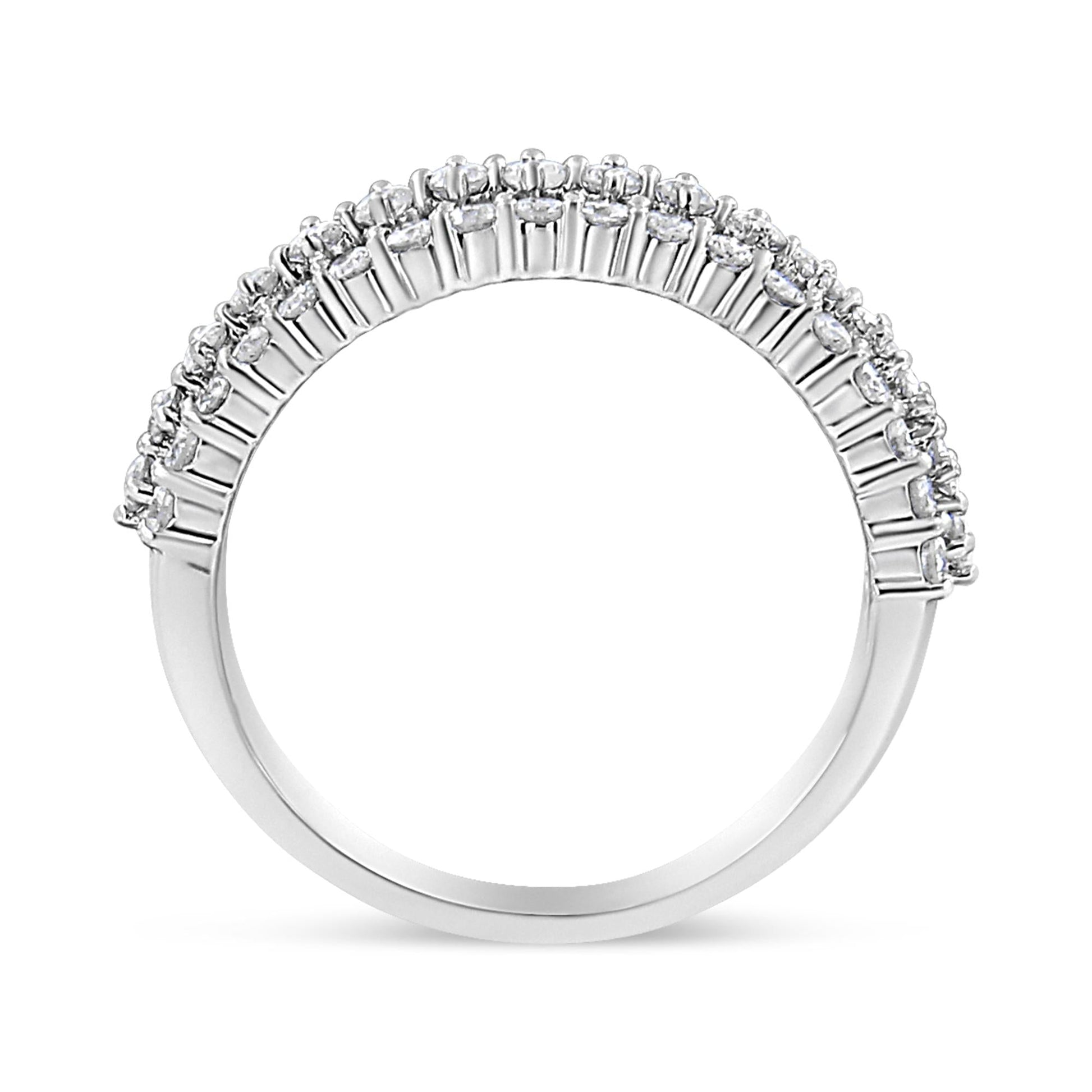 Three rows of natural, round-cut diamonds shine bright on this magnificent modern band. Created in gleaming 14k white gold, this ring showcases 1 carat of stunning diamonds in a classic prong setting. This band is the perfect accessory for any occasion. You can pair it with your everyday wear or accessorize a formal gown with it. Invest in this glamorous ring and elevate your jewelry collection.