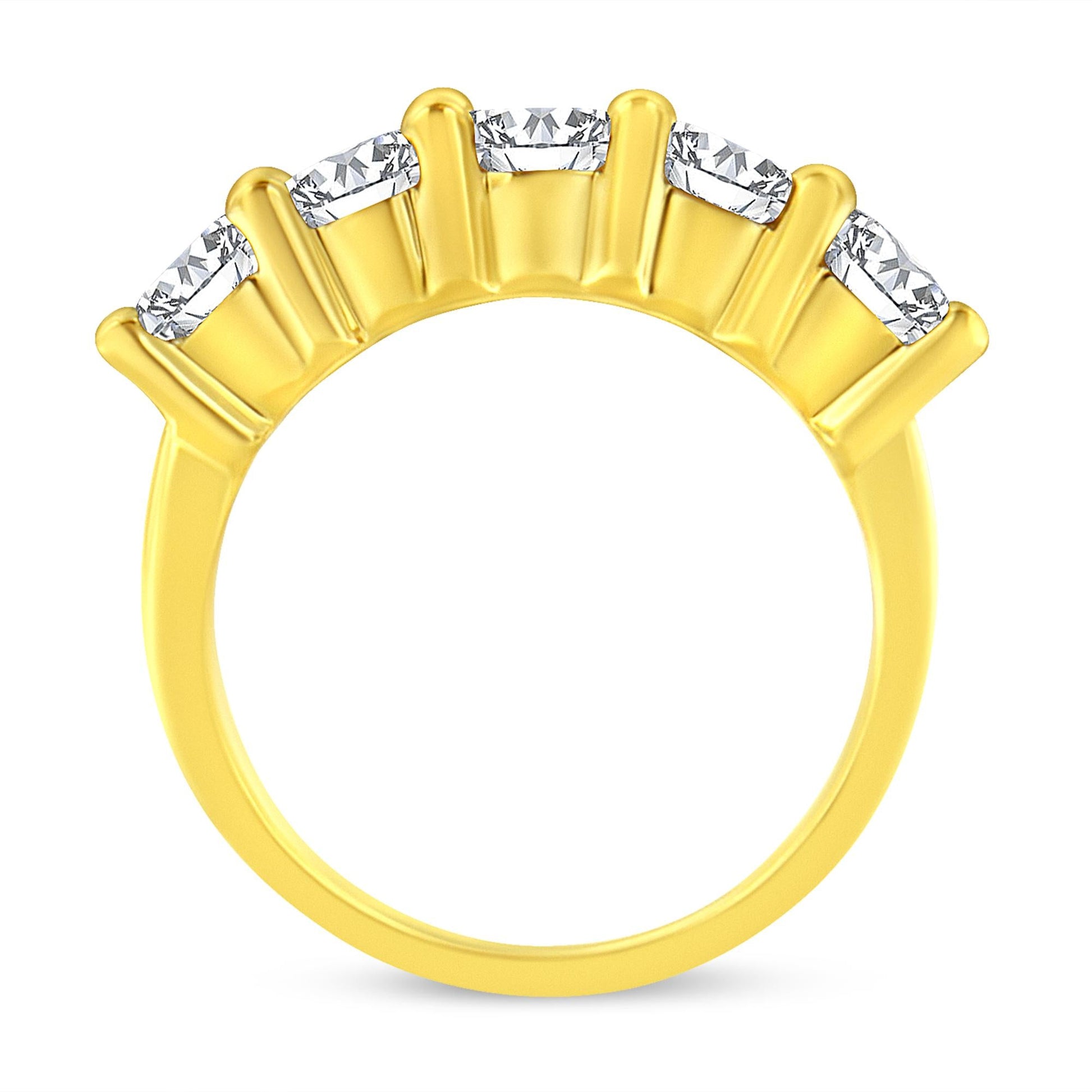 The Eternal five-stone diamond ring is just that, a timeless design that symbolizes a lasting love. Five round brilliant-cut diamonds weighing approximately 2-carat total weight sit securely in shared prongs spanning across the top of the ring. This enduring 14K Yellow Gold Plated .925 Sterling Silver five-stone ring style is an incredibly wearable essential. Show your love and celebrate your wedding or anniversary with this beautiful diamond band.