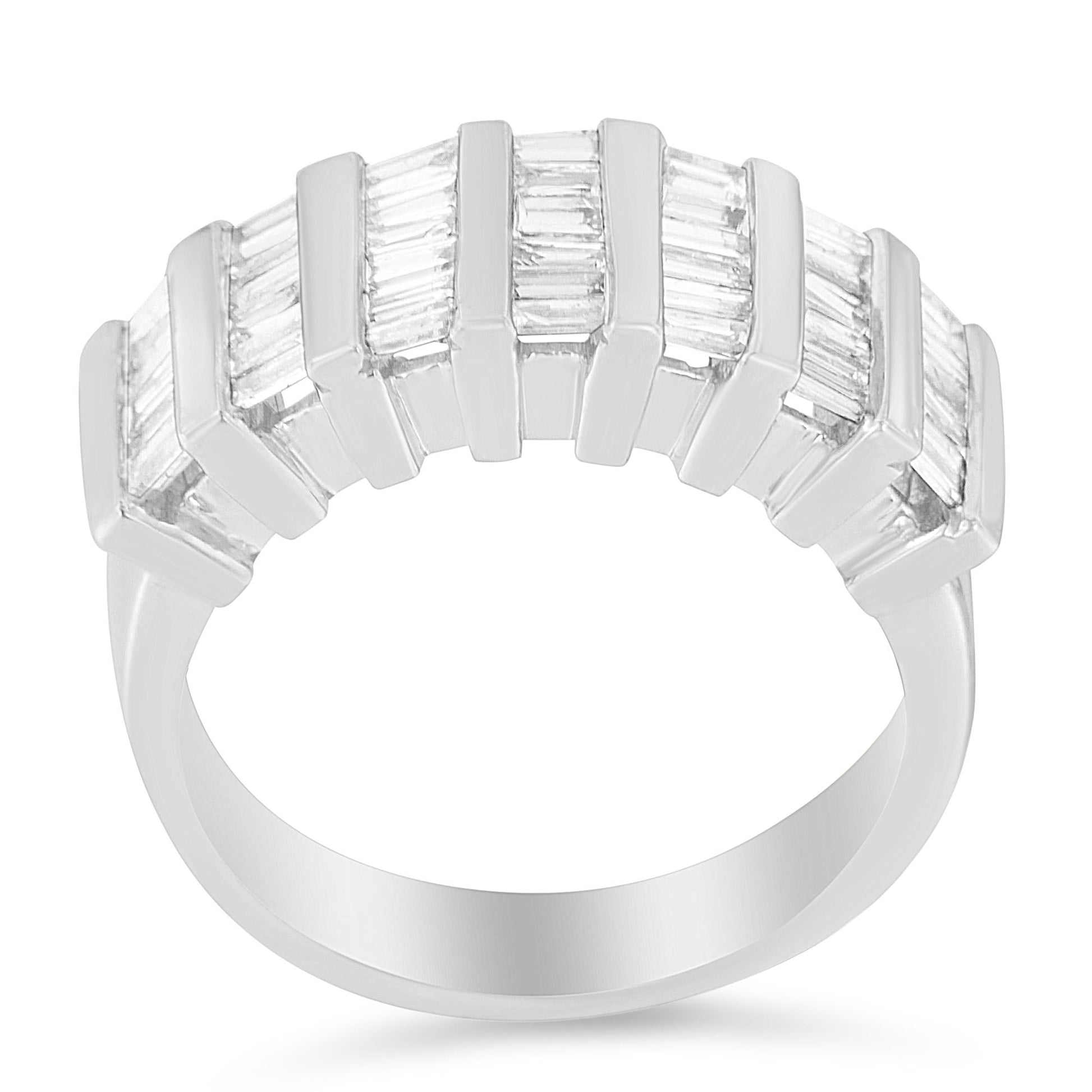 Elegant and timeless, this modern band style unisex wedding ring for men and women features 1.0 carat total weight of diamonds with 42 individual stones. The rectangular, baguette cut gems are channel set between vertical lines of fluting for a sophisticated look. The wide multi-row fashion ring has a tapered, flat-style shank with a high shine, polished finish. The ring is made of genuine 92.5% sterling silver and is plated with rhodium for tarnish free wear. This classic, bold wedding band makes a great way to seal your union and is certain to be the envy of all your friends! Whether worn for daytime glamour or evening sparkle, this modern band is gorgeously versatile. It’s a timeless treasure she’ll enjoy wearing every day.